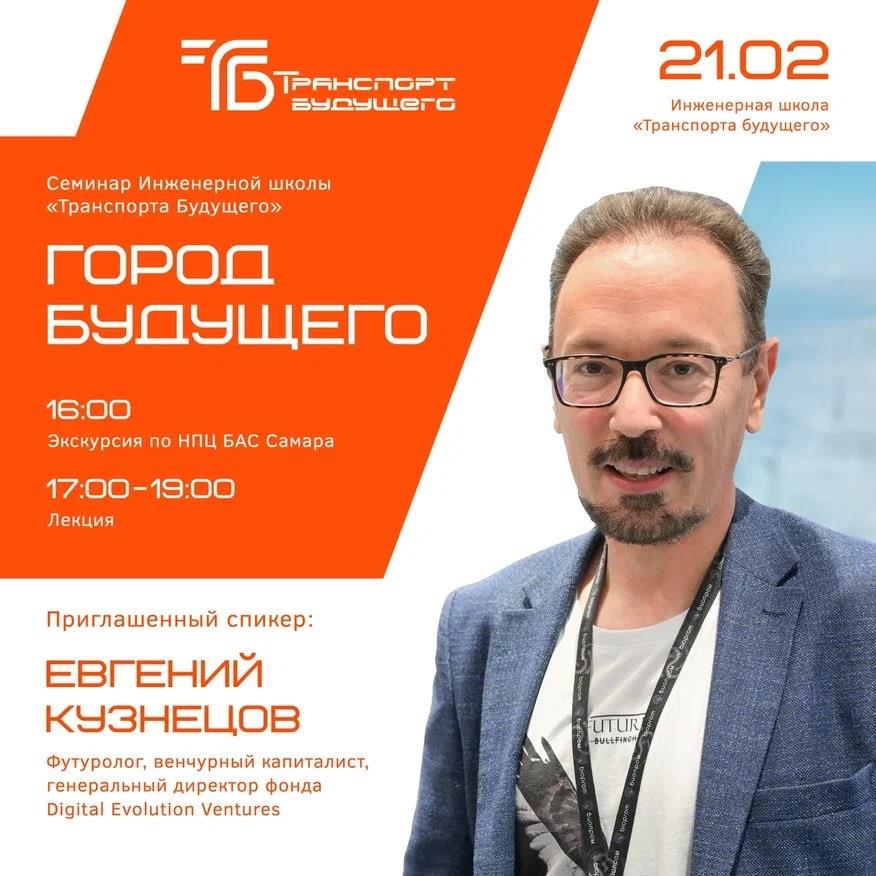 Компания "Транспорт будущего" привозит из Москвы известного футуролога с семинаром о городе будущего. Какие технологии уже сегодня меняют городскую среду в самых продвинутых урбанизациях и как будет выглядеть город будущего с использованием технологий завтрашнего дня. Какое место в будущем городе займут беспилотники и роботы? Будет ли в нем место человеку? Об этом и не только — на семинаре генерального директора фонда Digital Evolution Ventures Евгения Кузнецова.