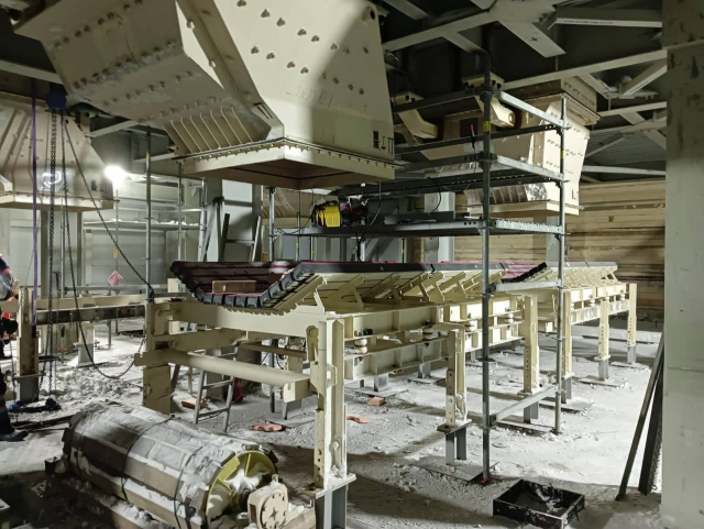 Сейчас уже идет монтаж загрузочной группы пересыпных узлов для двух следующих конвейерных линий. Смонтированы установки концевых барабанов и секций приемных столов, готовится строительная часть соседнего корпуса к монтажу следующих пересыпных узлов и конвейеров. А в марте планируется установка пластинчатых питателей.