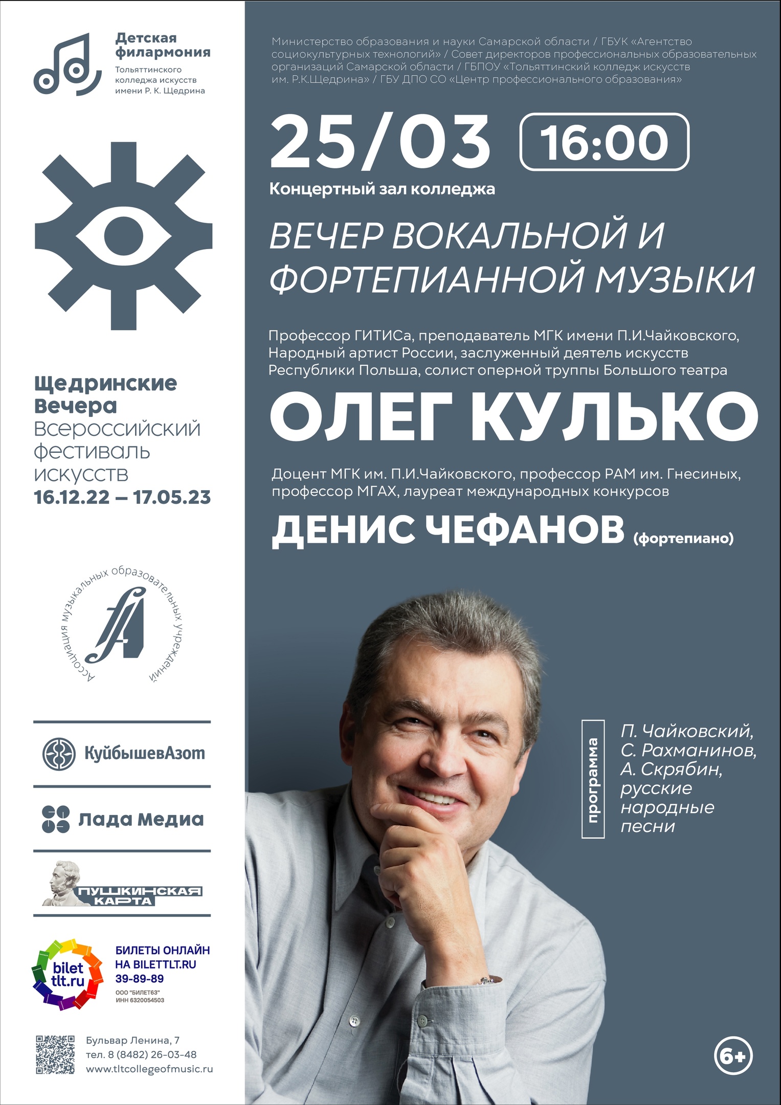 25 марта Детская филармония Тольяттинского колледжа искусств имени Р.К.Щедрина приглашает на вечер вокальной и фортепианной музыки. На сцене Детской филармонии выступит Народный артист России Олег Кулько . Партия фортепиано – профессор РАМ имени Гнесиных Денис Чефанов .