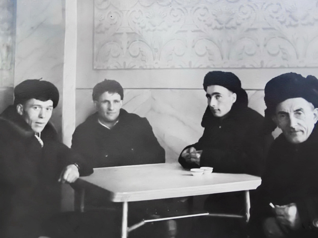 - Меню прочитано, заказ сделан. На первое - русская солянка мясная сборная, на второе - мясо по-французски, а на третье компот с кусочком бисквита. В ожидании выполнения заказа: Вережников А., Якорхин Г., Якорхин М., Божедомов Н., - говорится в подписи к историческому фото.