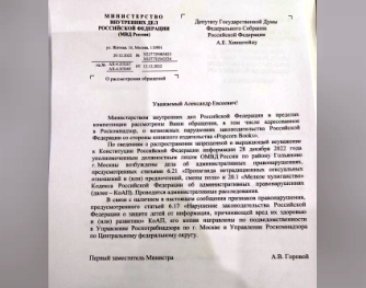 «Как следует из ответа МВД на мой запрос, дело по ст. 6.21 КоАП (пропаганда нетрадиционных сексуальных отношений и (или) предпочтений, смены пола) возбуждено ОМВД «Гольяново» 28 декабря. Одновременно дело возбуждено и по ст. 20.1 (мелкое хулиганство)», - написал парламентарий в соцсети.