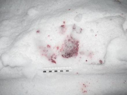 Сотрудник дежурной части незамедлительно направил на место происшествия ближайшие автопатрули и следственно-оперативную группу. Во время осмотра указанного заявителем места, полицейские обнаружили следы протекторов шин, предположительно снегохода, бурые пятна на снегу, похожие на кровь, гильзы.