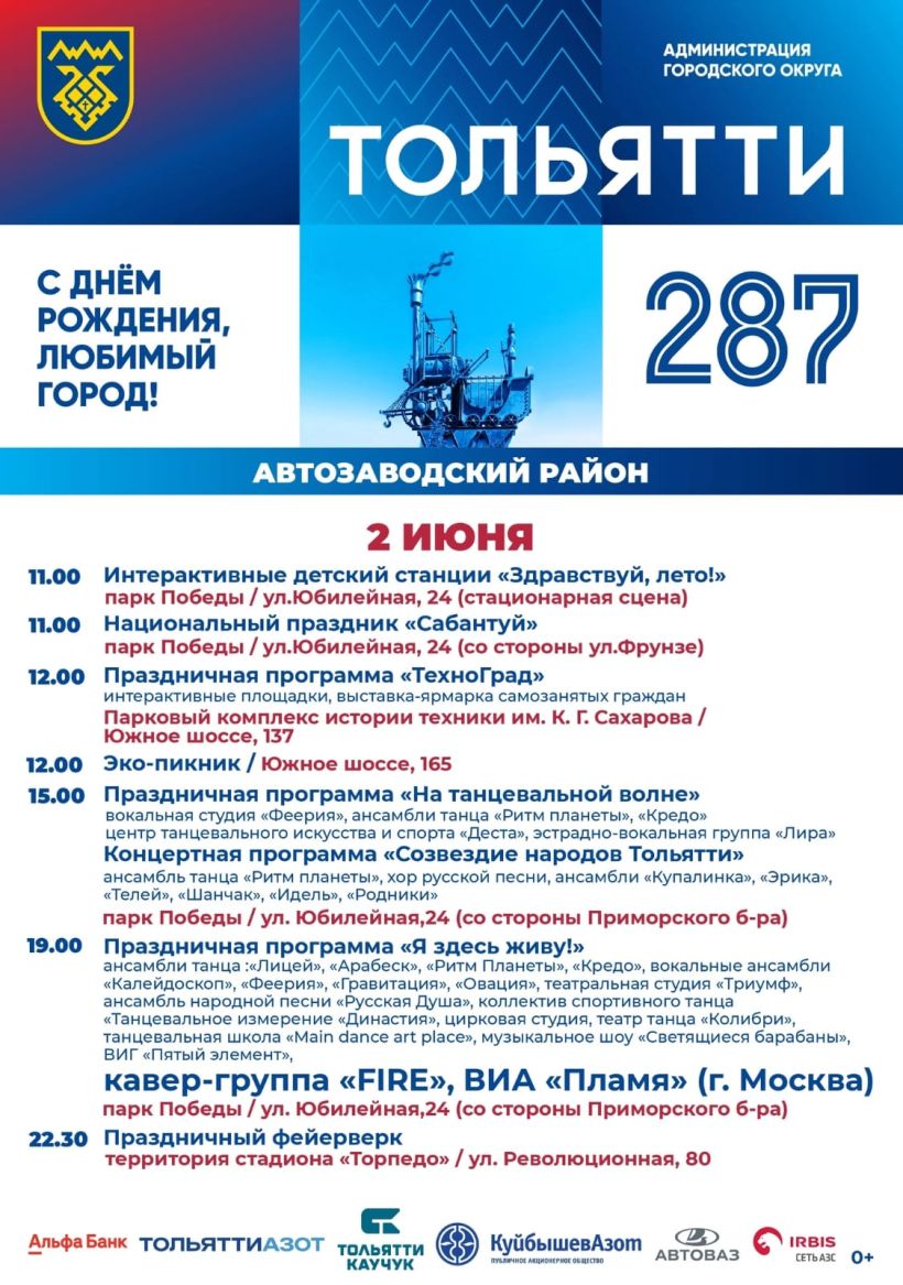 В этом году Ставрополю–Тольятти исполняется 287 лет! В этом году День города пройдёт 2 июня. Праздничные площадки с развлекательными программами будут развернуты во всех районах города.