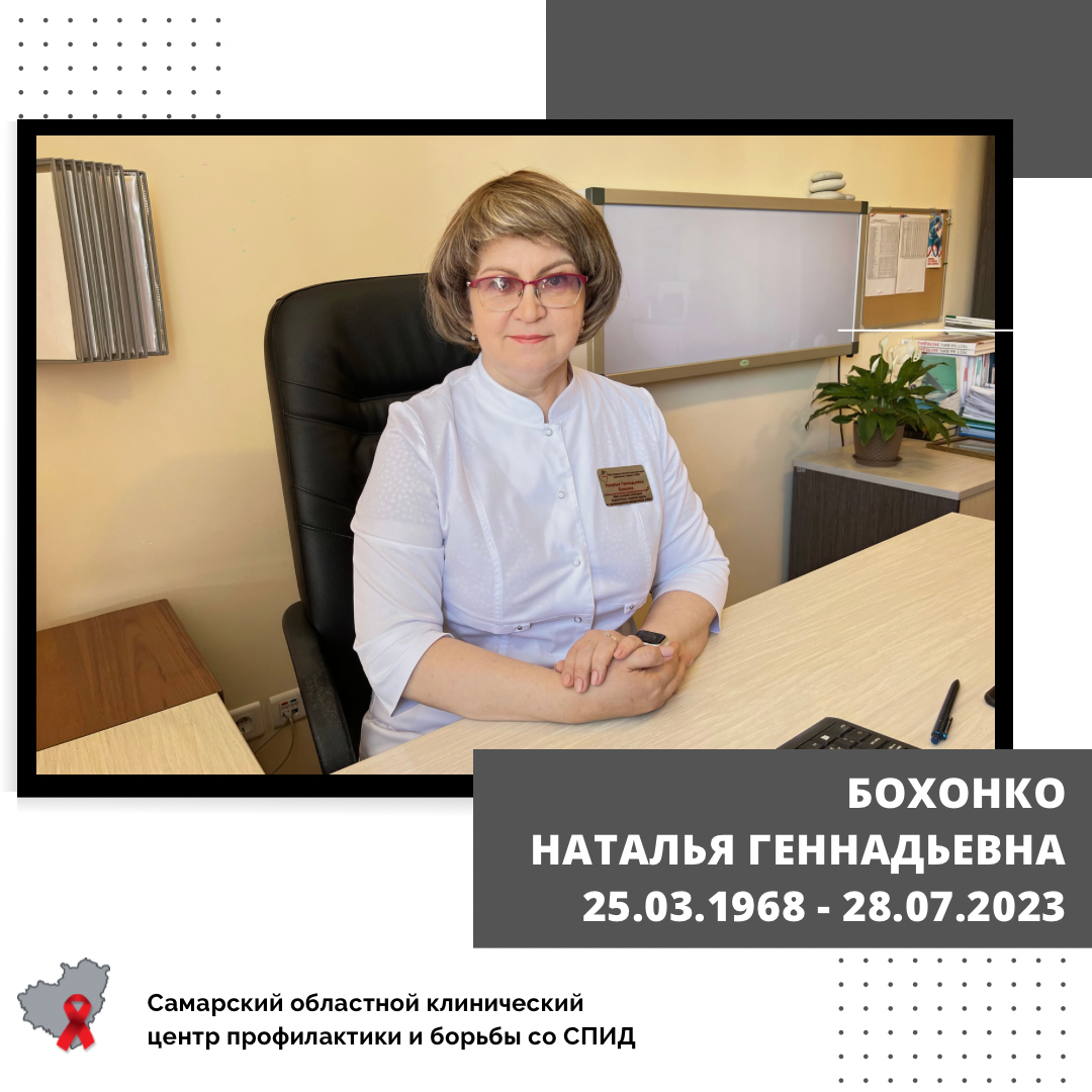С прискорбием сообщаем, что 28 июля на 56 году после продолжительной болезни ушла из жизни заместитель главного врача по организационно-методической работе Самарского областного клинического центра профилактики и борьбы со СПИД Наталья Геннадьевна Бохонко.