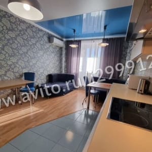 Кухня-гостиная, комната с двуспальной кроватью, диваном, 2 кресла, стол комп.; Гардеробная, раздельный с/узел, огромный коридор с очень вместительным шкафом-купе, лоджия.